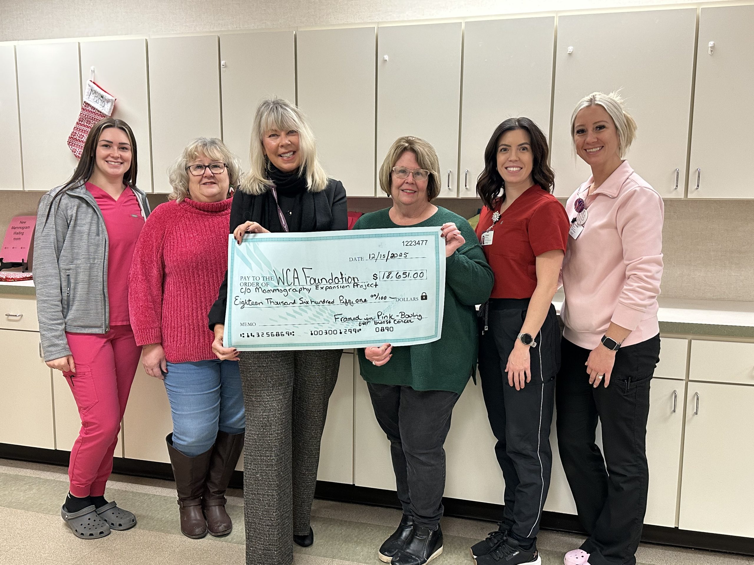Framed In Pink, an endowment fund established by the late Sue Lamb and her family at the WCA Foundation presented a check of $18,651 from the proceeds of their Framed in Pink Bowling Over Breast Cancer event that was held on October 5, at Jamestown Bowling Company to UPMC Chautauqua Mammography Department staff. The funds will benefit UPMC Chautauqua’s Mammography Department expansion project that will improve patients’ comfort and care. The WCA Foundation has completed their breast cancer campaign for capital improvement. The project is expected to be completed in 2026. L-R: Emily Zamboink, UPMC Chautauqua, Patti Reed, Kristin Melville, WCA Foundation, Julie Abramson, Eileen Bertrando and Brooke Mareri, UPMC Chautauqua. The Framed in Pink Committee is underway with their 2026 event planning. For More Information and to sponsor contact, Julie Abramson, at julieabramson@yahoo.com, or to make a donation visit wcafoundationjamestown.org, or call at 716-664-2100.